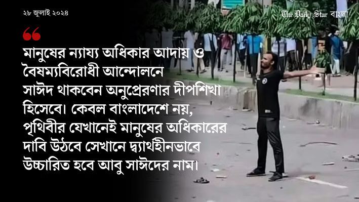 আমি সেই ভদ্রলোক হতে চাই না যে ভদ্রলোকিতা পালাতে শেখায়, সত্যের মুখোমুখি হতে ভয় পায়। আমি দ্রোহ চাই, আমার ভাই আবু সাঈদের মতো প্রকাণ্ড সাহসের মূর্তি হতে চাই। দুই হাত প্রসারিত করে গুলির মুখে বুক পেতে দিতে চাই। হাসতে-হাসতে মরতে চাই… তবু আক্ষেপের মরণ চাই না!